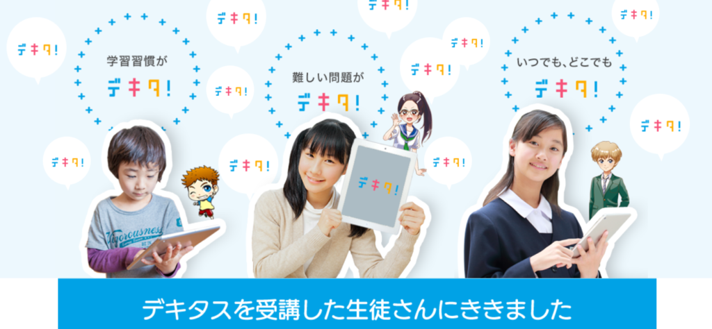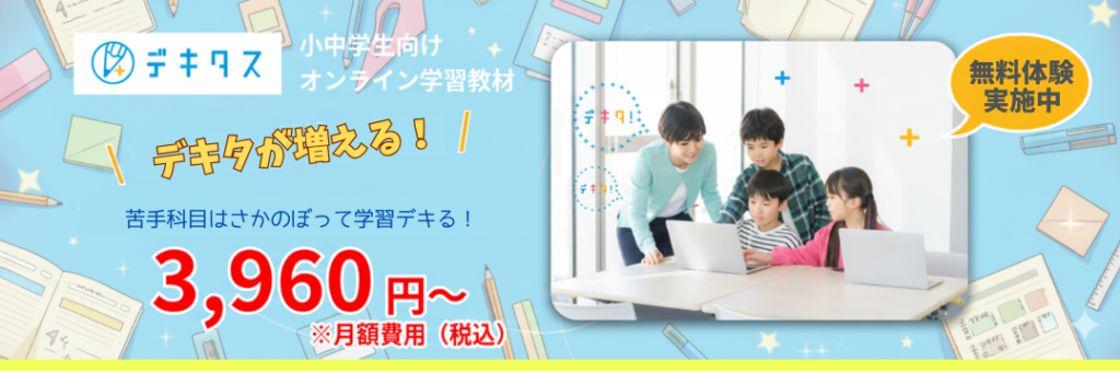 デキタスは小学生・中学生向けのオンライン学習教材で、特徴は「やる気が出ない子でも自然に学習習慣が身につく」点です。