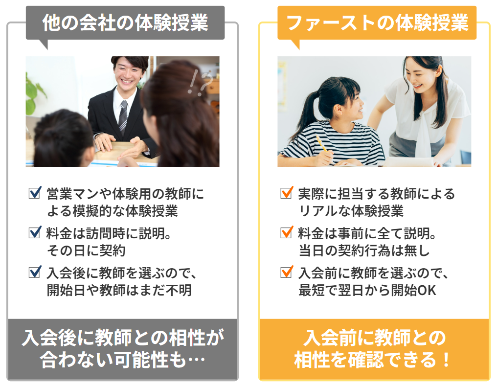 一般的な家庭教師センターでは、営業担当が体験を行い、入会後に別の先生が派遣されることが少なくありません。しかし、ファーストは「実際の担当講師」による無料体験が受けられるため、入会後のミスマッチを最小限に抑えられます。