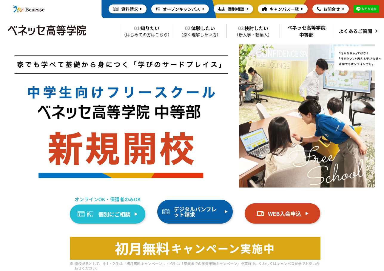 2025年4月1日にスタートした高校生向けの通信制サポート校「ベネッセ高等学院」に続き、中学生向けにフリースクール「ベネッセ高等学院 中等部」を開校。中等部は、高等学院に併設する形で展開します。全国11か所で展開するキャンパスへの通学、またはオンライン学習が選択でき、全国からの入会が可能です。