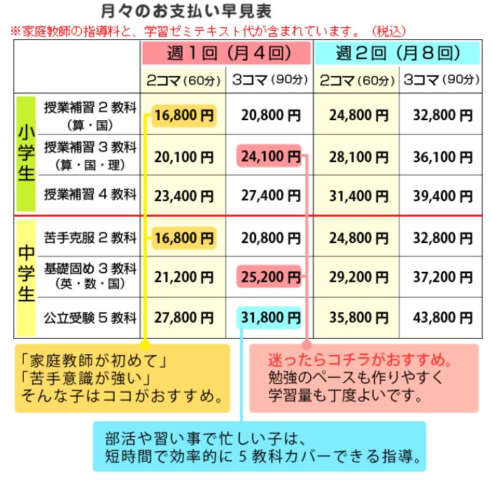 家庭教師のガンバの料金プラン(目安)