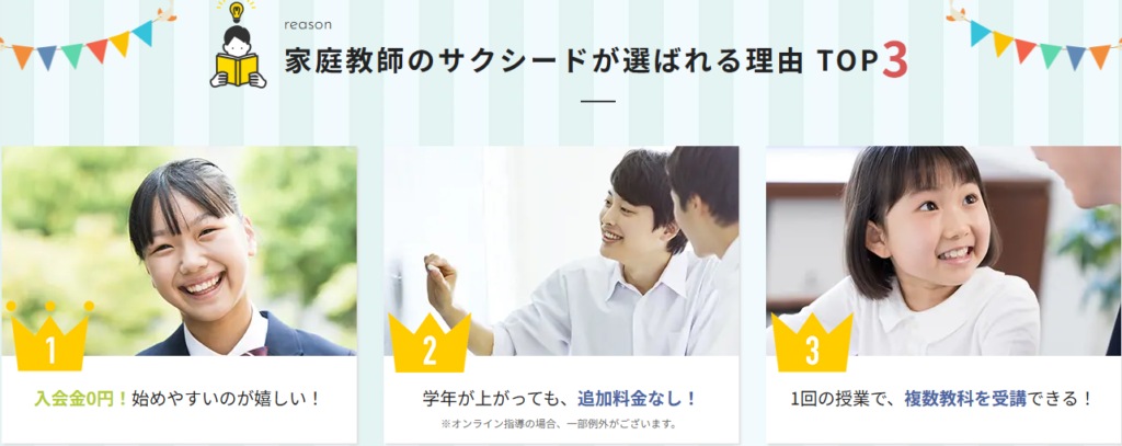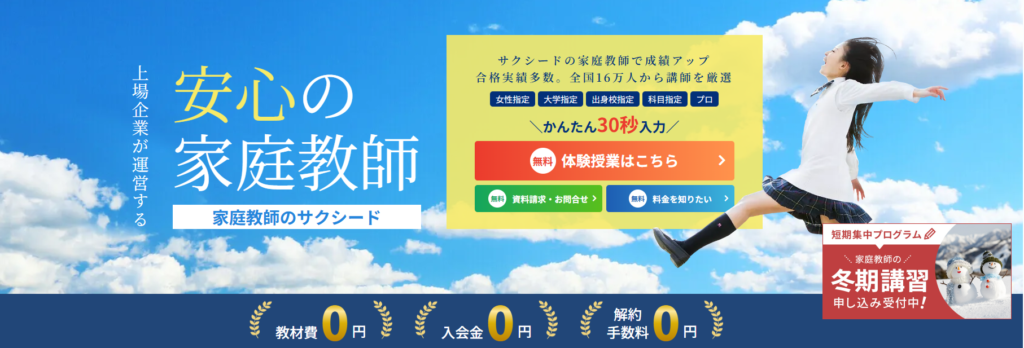家庭教師サクシードは、東京都、神奈川県、埼玉県、兵庫県などの地域を中心に展開する家庭教師派遣サービスです。最大の特徴は、「入会金が0円、追加教材費がかからない」という点にあります。
